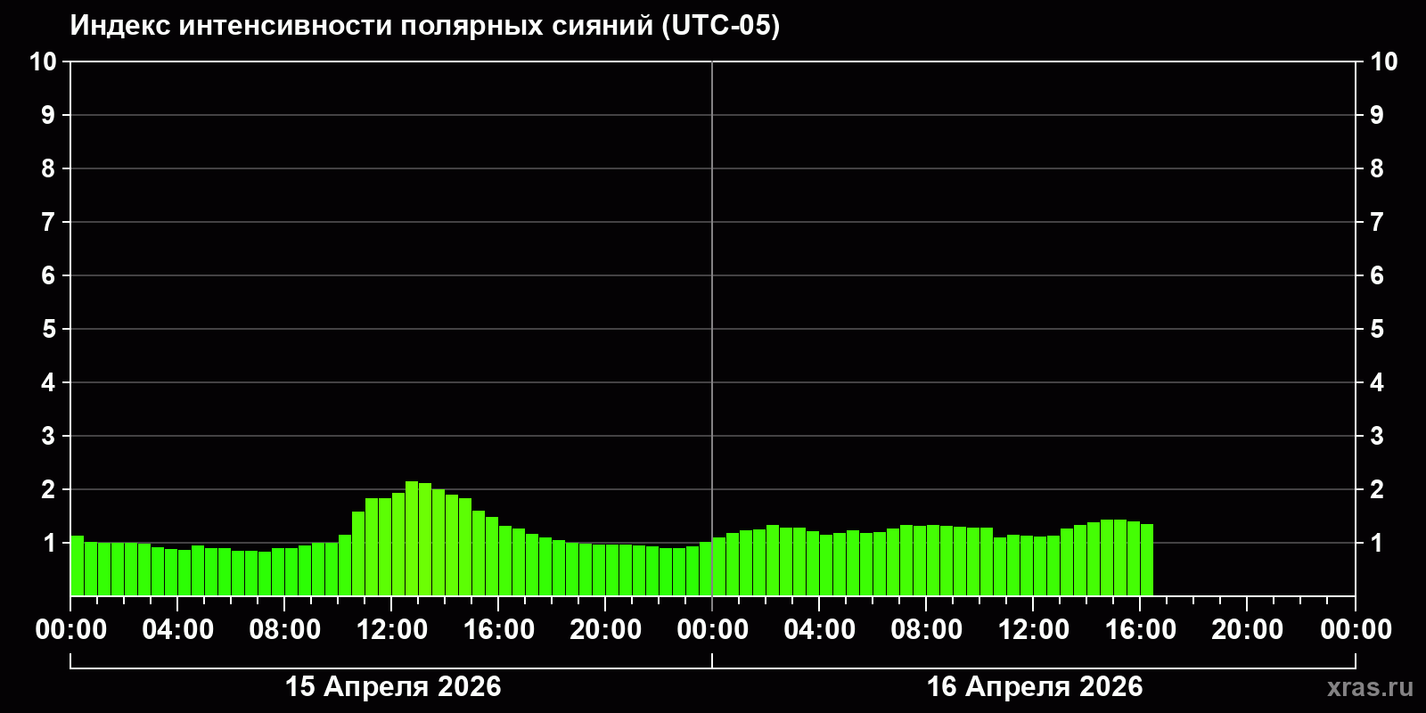 Изменения индекса интенсивности полярных сияний с 2026-04-15 по 2026-04-16 по местному времени