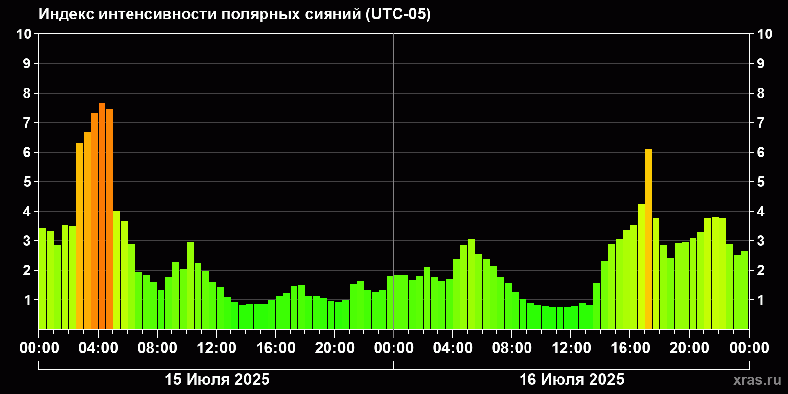 Изменения индекса интенсивности полярных сияний с 2025-07-15 по 2025-07-16 по местному времени