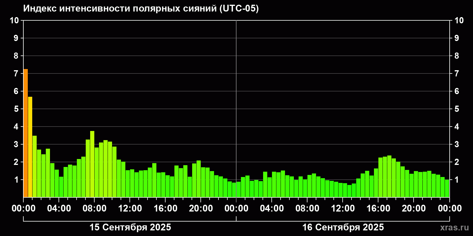 Изменения индекса интенсивности полярных сияний с 2025-09-15 по 2025-09-16 по местному времени