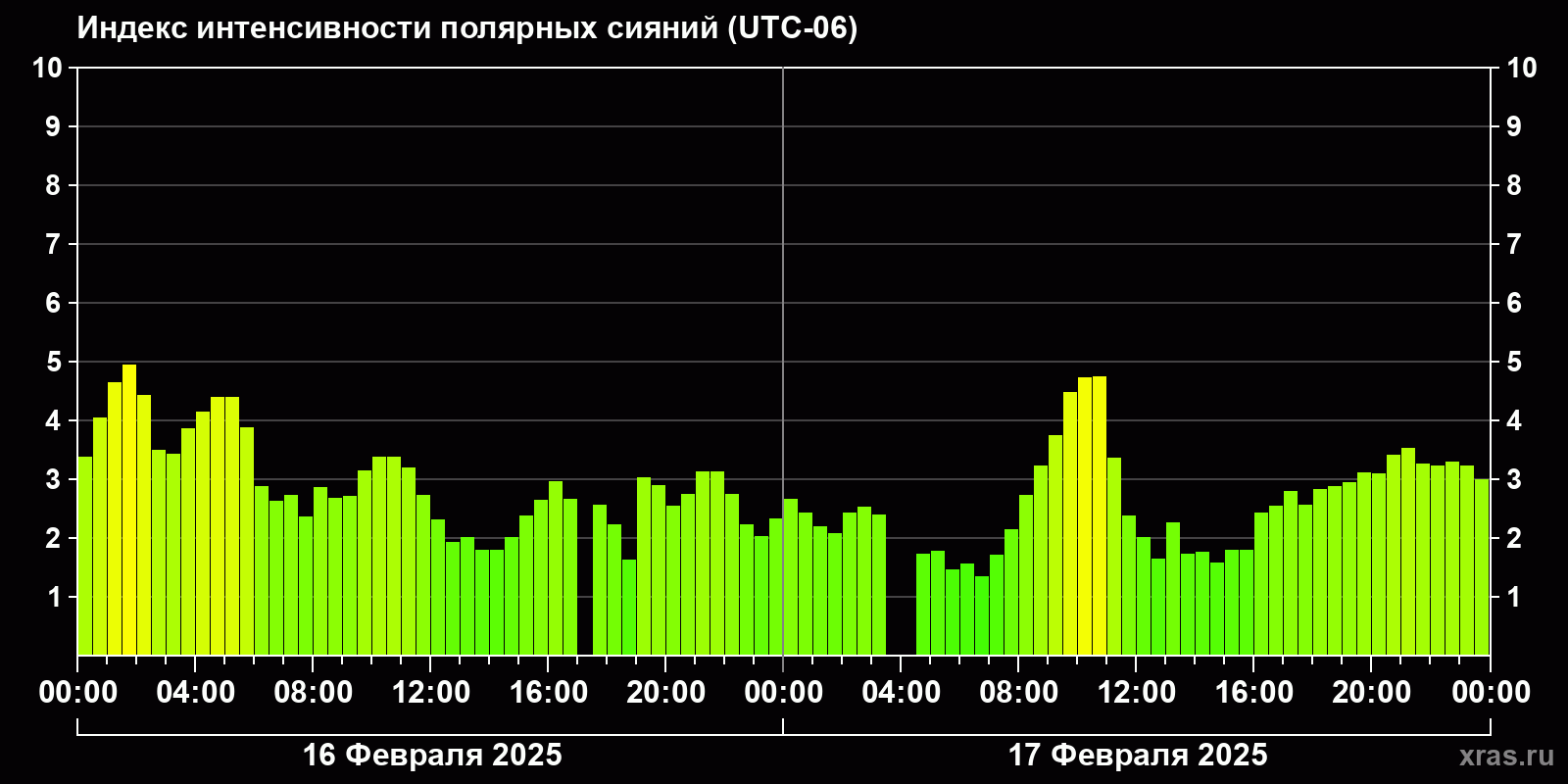 Изменения индекса интенсивности полярных сияний с 2025-02-16 по 2025-02-17 по местному времени
