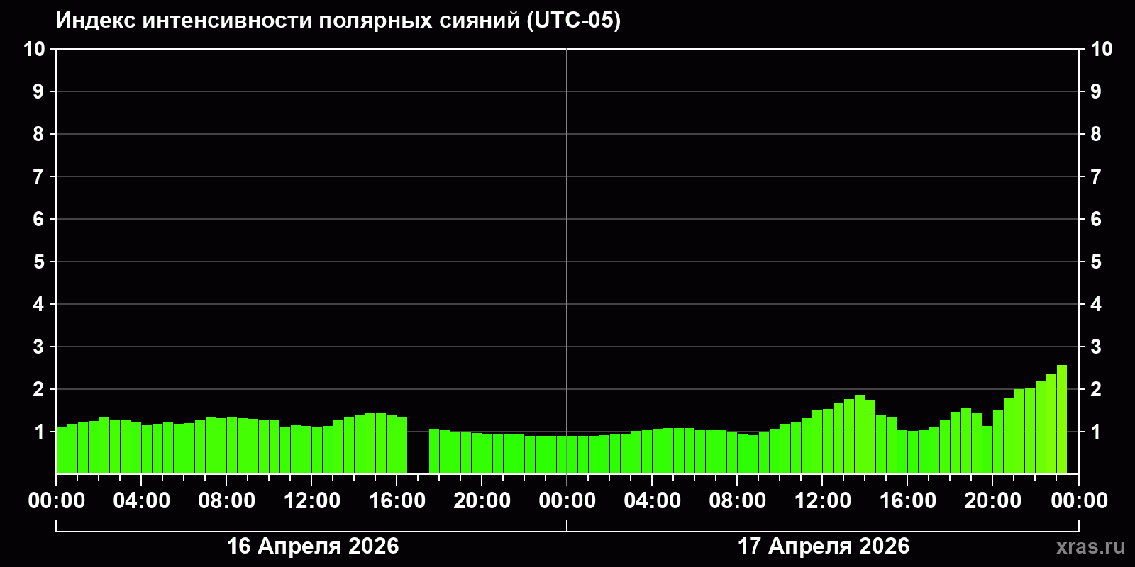 Изменения индекса интенсивности полярных сияний с 2026-04-16 по 2026-04-17 по местному времени