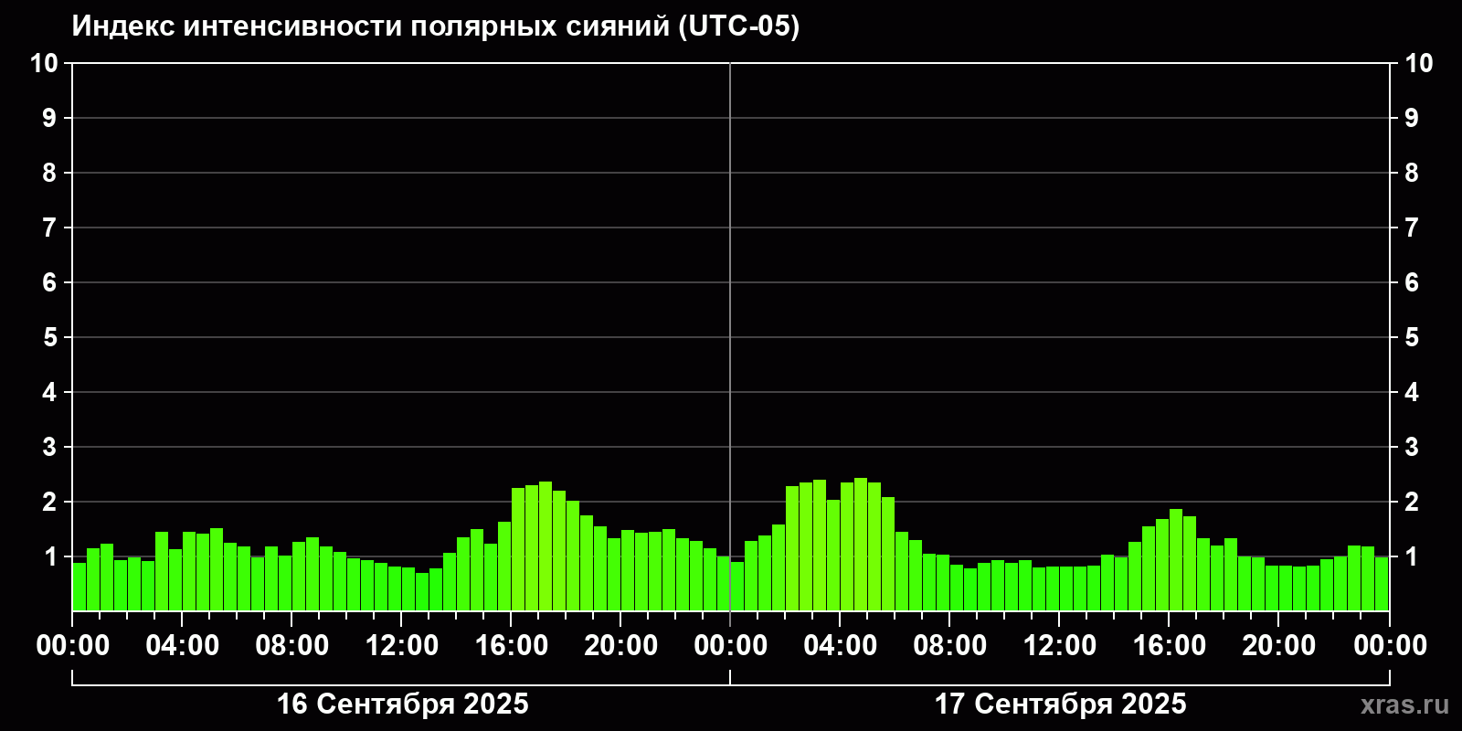 Изменения индекса интенсивности полярных сияний с 2025-09-16 по 2025-09-17 по местному времени