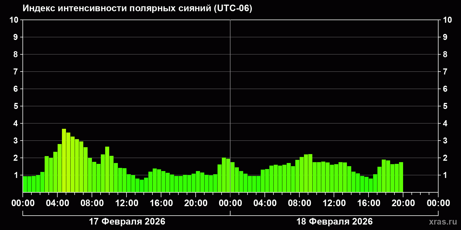 Изменения индекса интенсивности полярных сияний с 2026-02-17 по 2026-02-18 по местному времени