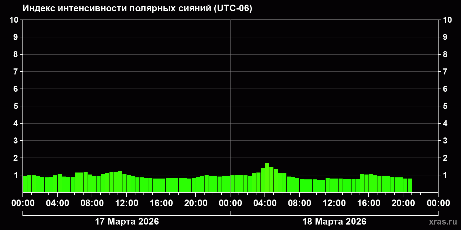 Изменения индекса интенсивности полярных сияний с 2026-03-17 по 2026-03-18 по местному времени