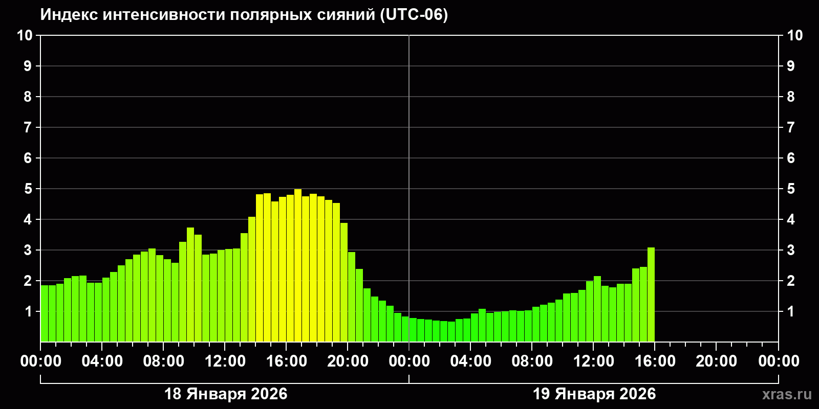 Изменения индекса интенсивности полярных сияний с 2026-01-18 по 2026-01-19 по местному времени