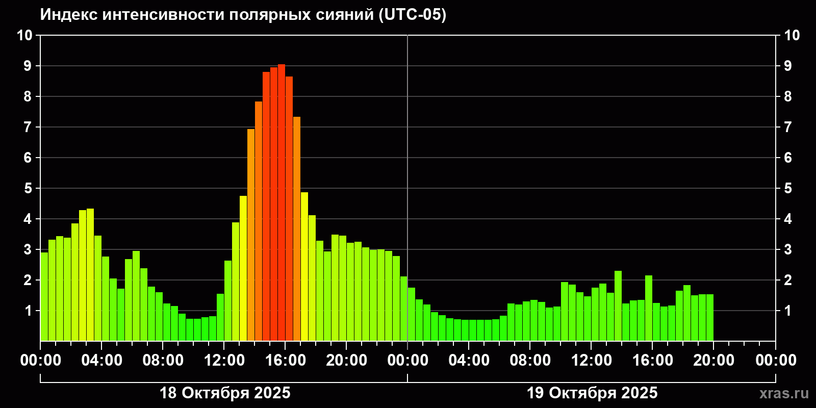 Изменения индекса интенсивности полярных сияний с 2025-10-18 по 2025-10-19 по местному времени