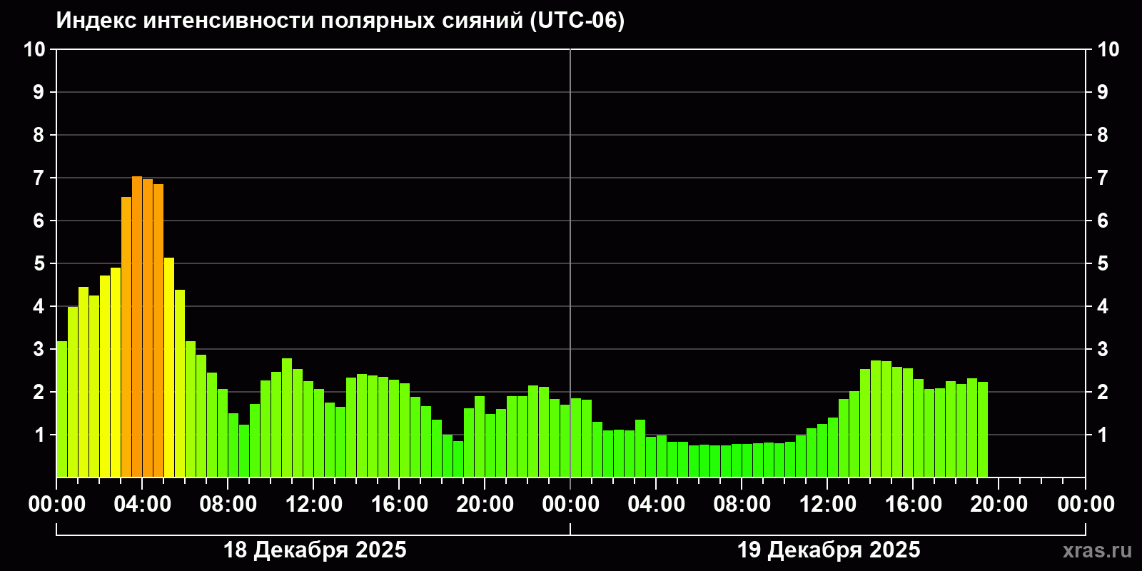 Изменения индекса интенсивности полярных сияний с 2025-12-18 по 2025-12-19 по местному времени