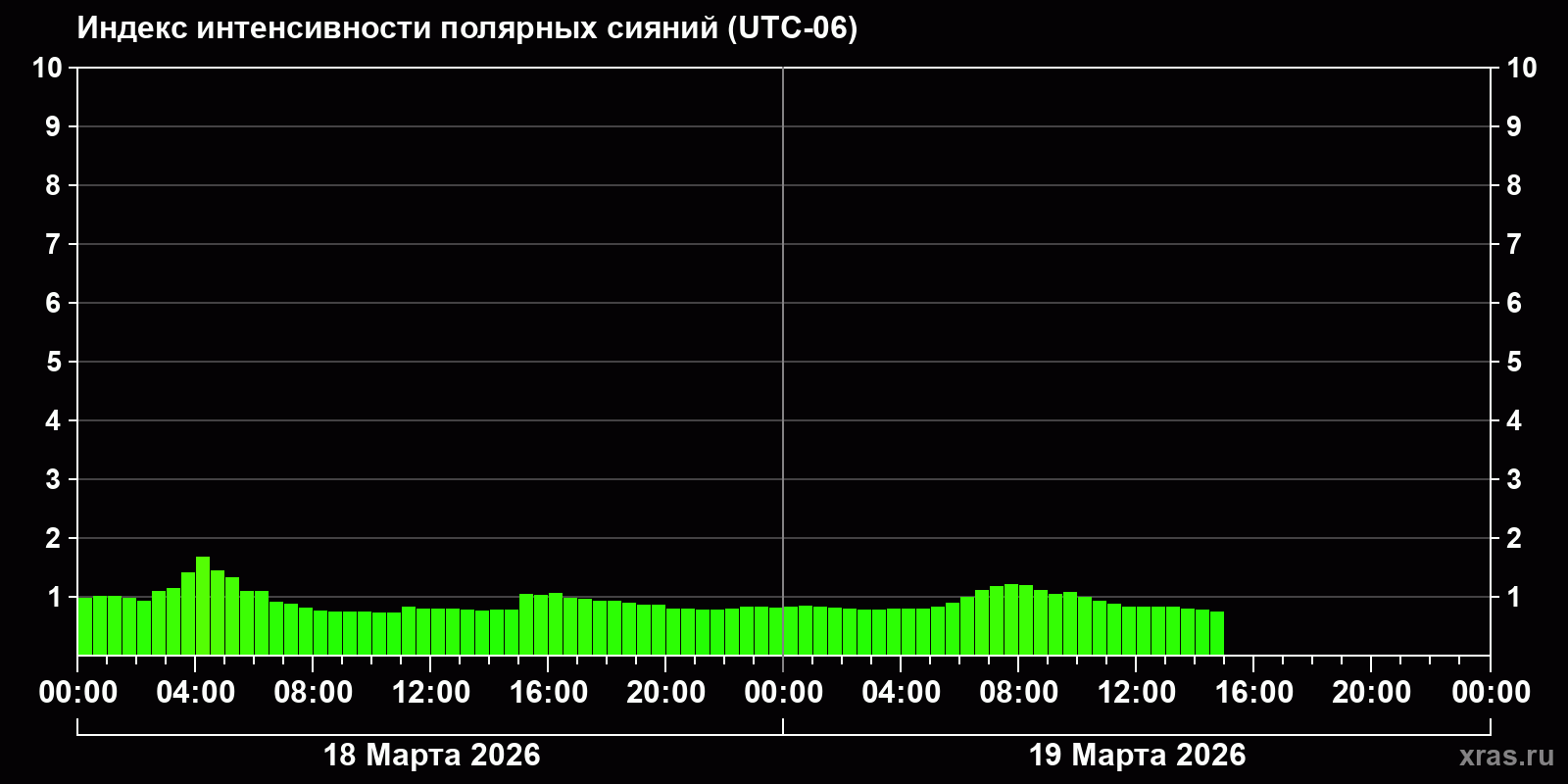 Изменения индекса интенсивности полярных сияний с 2026-03-18 по 2026-03-19 по местному времени