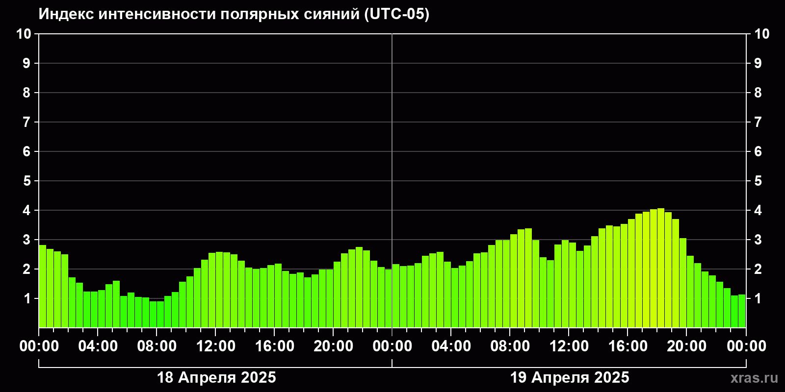 Изменения индекса интенсивности полярных сияний с 2025-04-18 по 2025-04-19 по местному времени