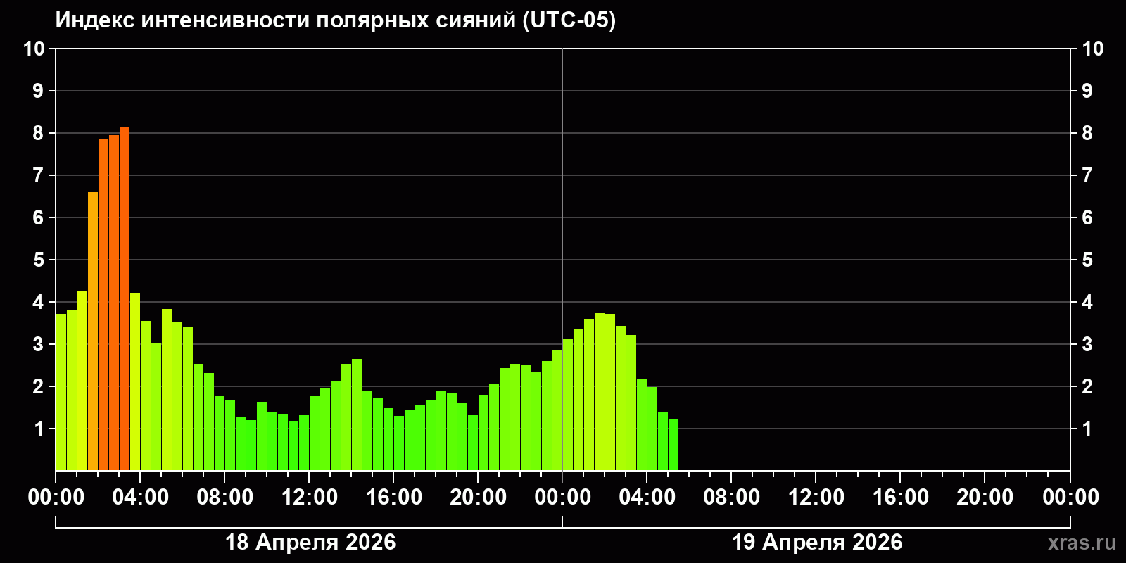 Изменения индекса интенсивности полярных сияний с 2026-04-18 по 2026-04-19 по местному времени