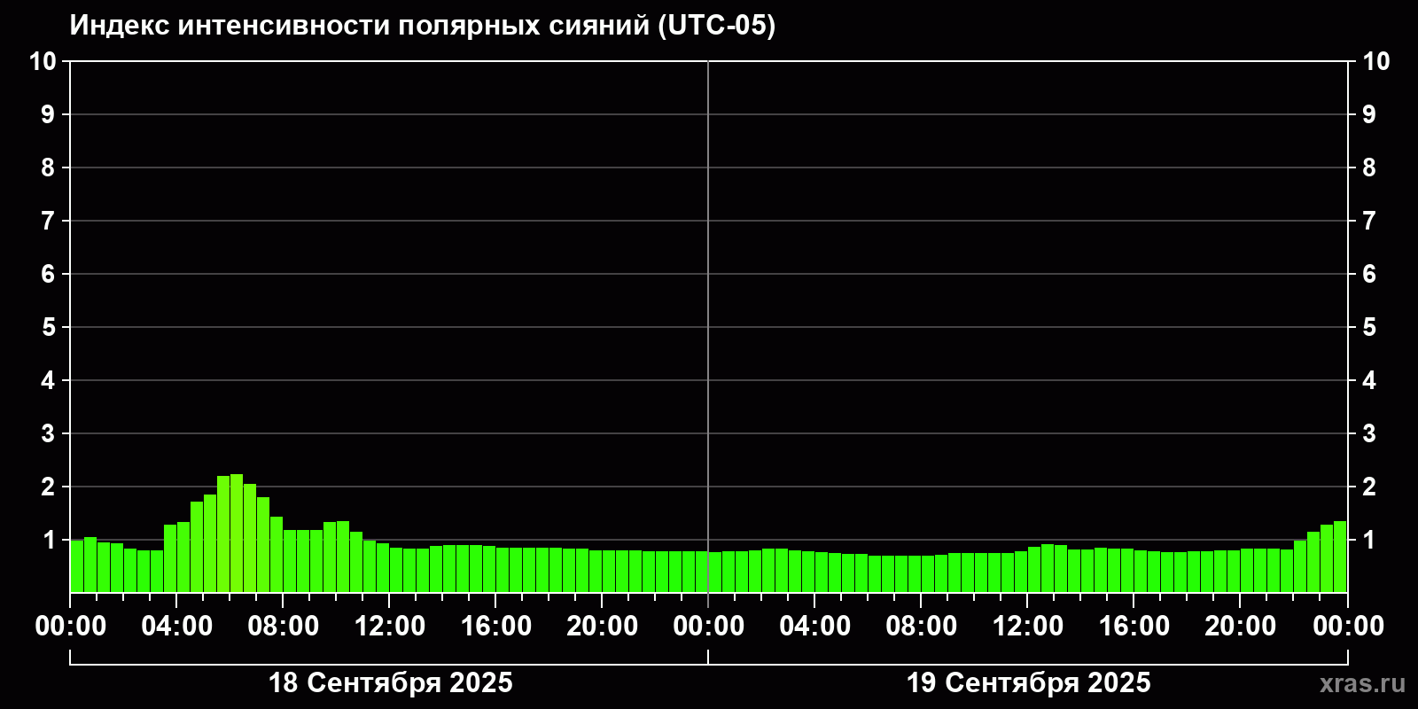 Изменения индекса интенсивности полярных сияний с 2025-09-18 по 2025-09-19 по местному времени