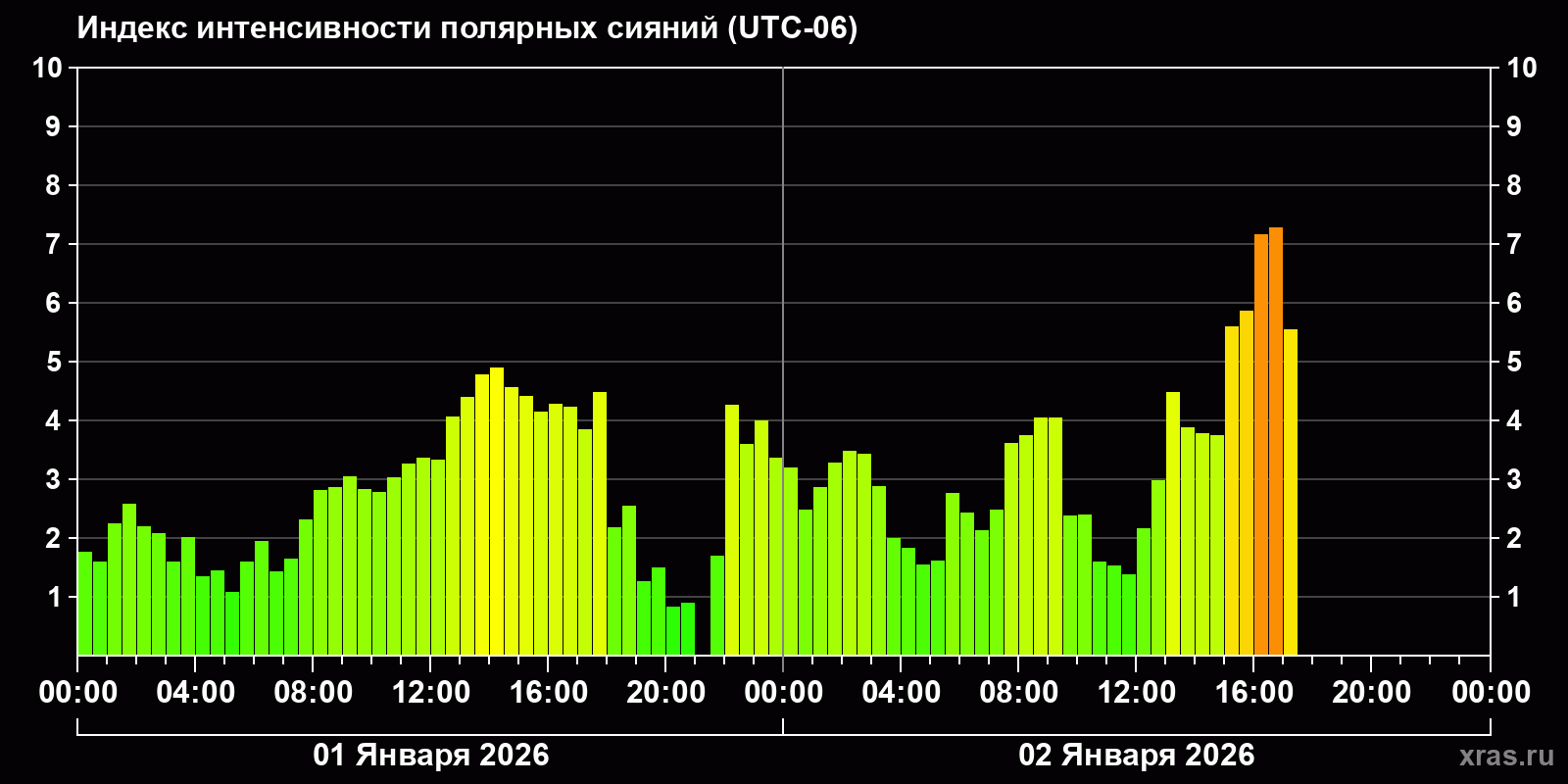 Изменения индекса интенсивности полярных сияний с 2026-01-01 по 2026-01-02 по местному времени