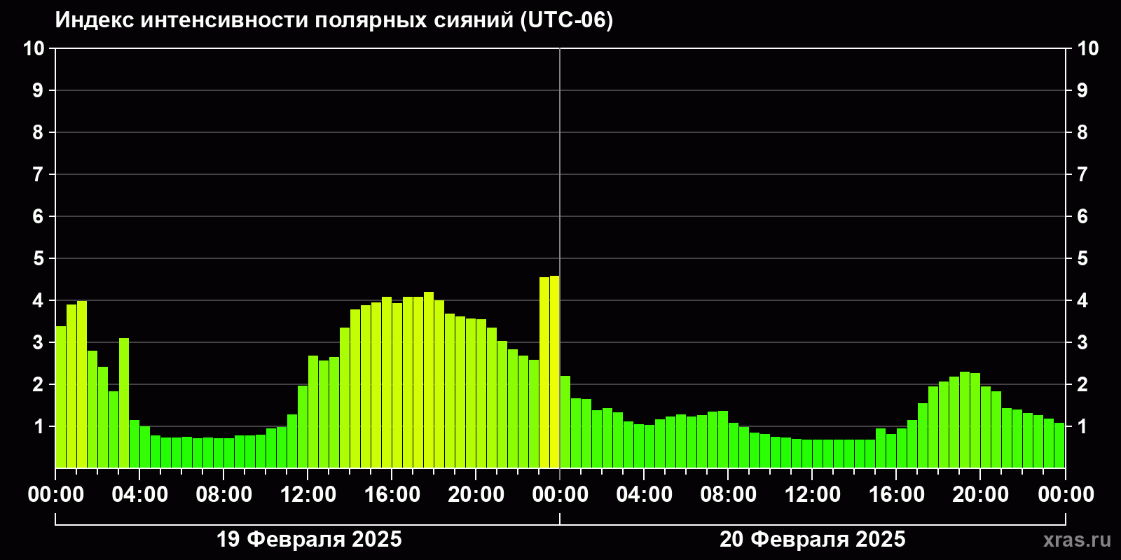 Изменения индекса интенсивности полярных сияний с 2025-02-19 по 2025-02-20 по местному времени