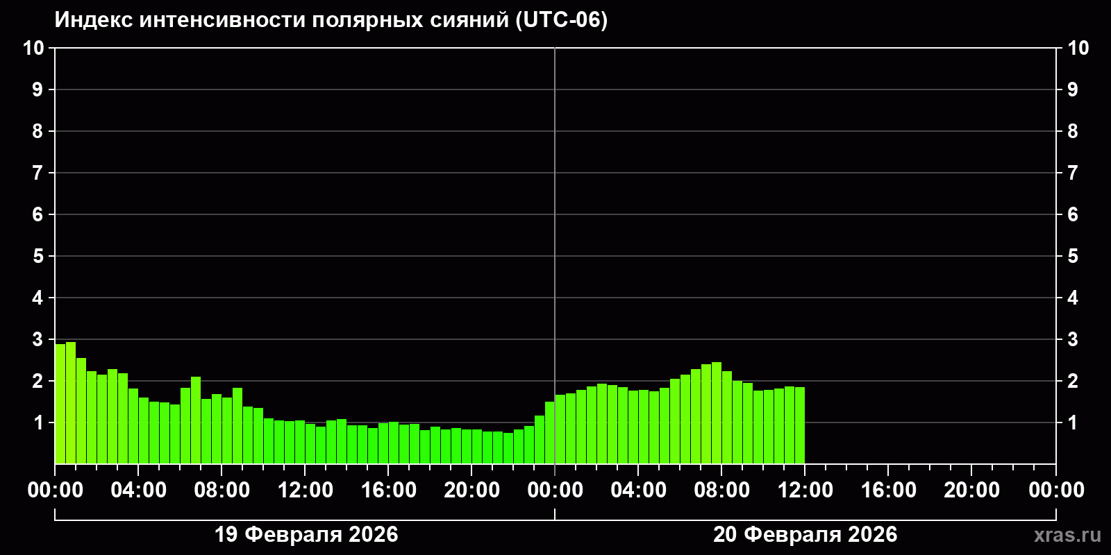 Изменения индекса интенсивности полярных сияний с 2026-02-19 по 2026-02-20 по местному времени