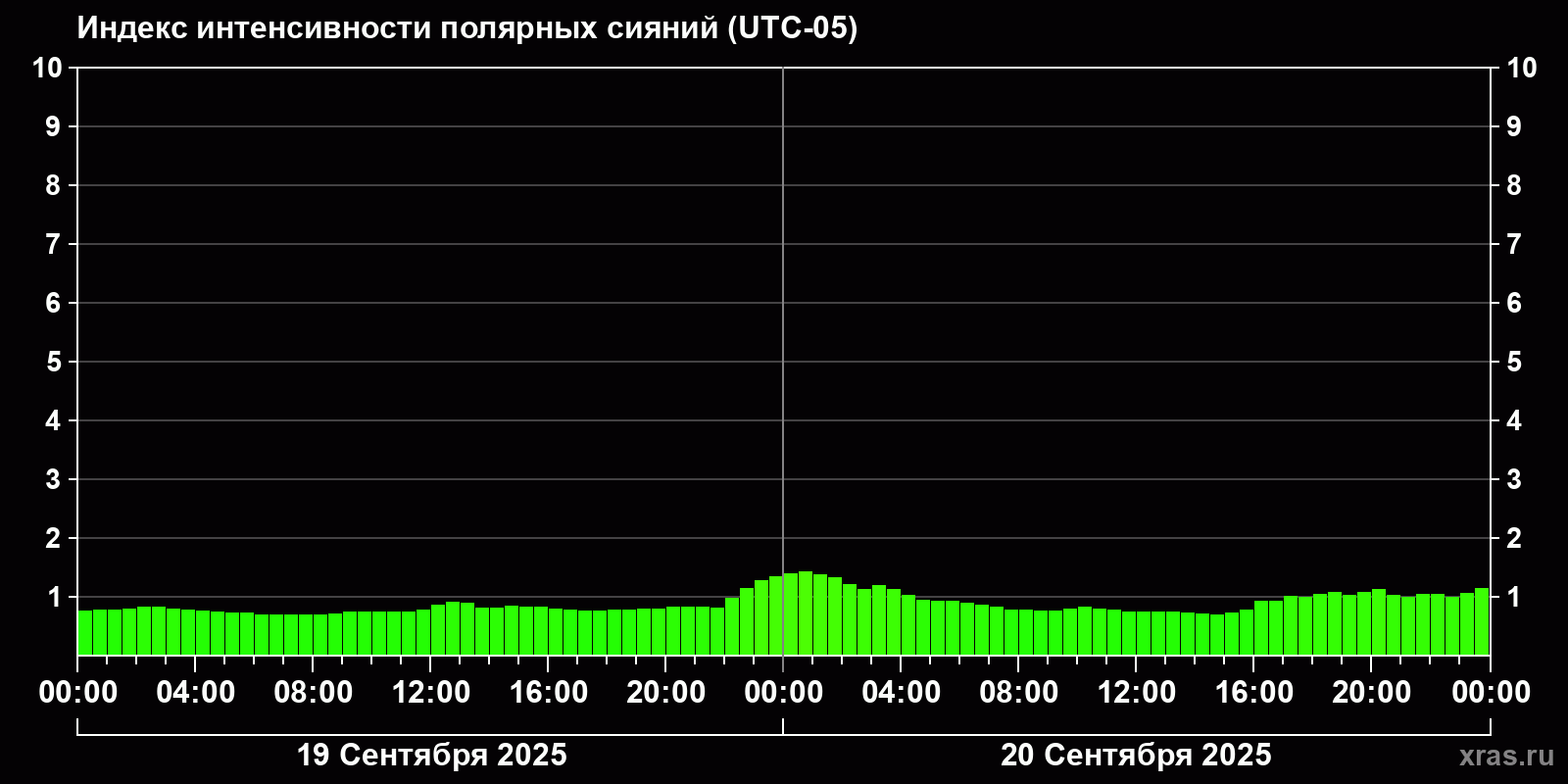 Изменения индекса интенсивности полярных сияний с 2025-09-19 по 2025-09-20 по местному времени