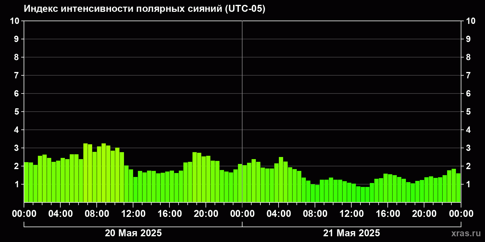 Изменения индекса интенсивности полярных сияний с 2025-05-20 по 2025-05-21 по местному времени