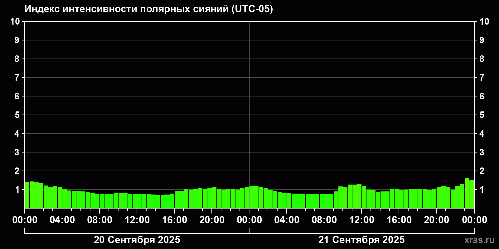 Изменения индекса интенсивности полярных сияний с 2025-09-20 по 2025-09-21 по местному времени