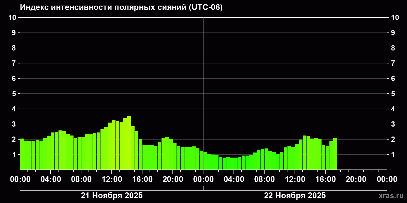 Изменения индекса интенсивности полярных сияний с 2025-11-21 по 2025-11-22 по местному времени