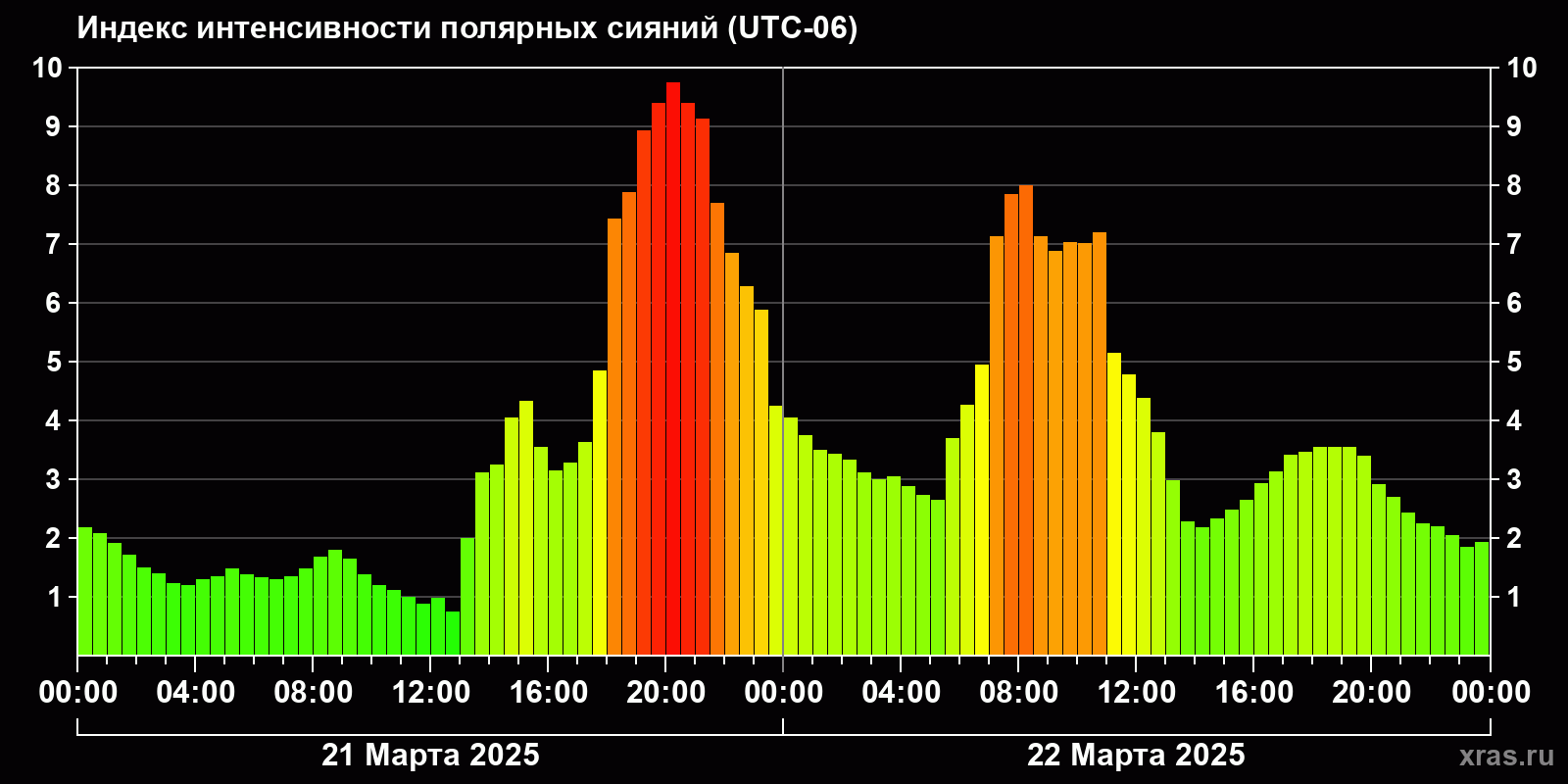 Изменения индекса интенсивности полярных сияний с 2025-03-21 по 2025-03-22 по местному времени
