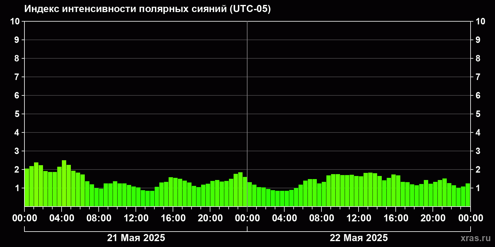 Изменения индекса интенсивности полярных сияний с 2025-05-21 по 2025-05-22 по местному времени
