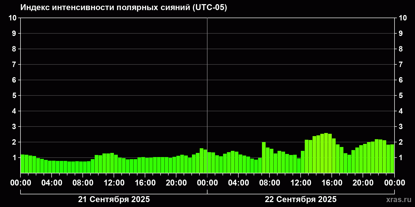 Изменения индекса интенсивности полярных сияний с 2025-09-21 по 2025-09-22 по местному времени