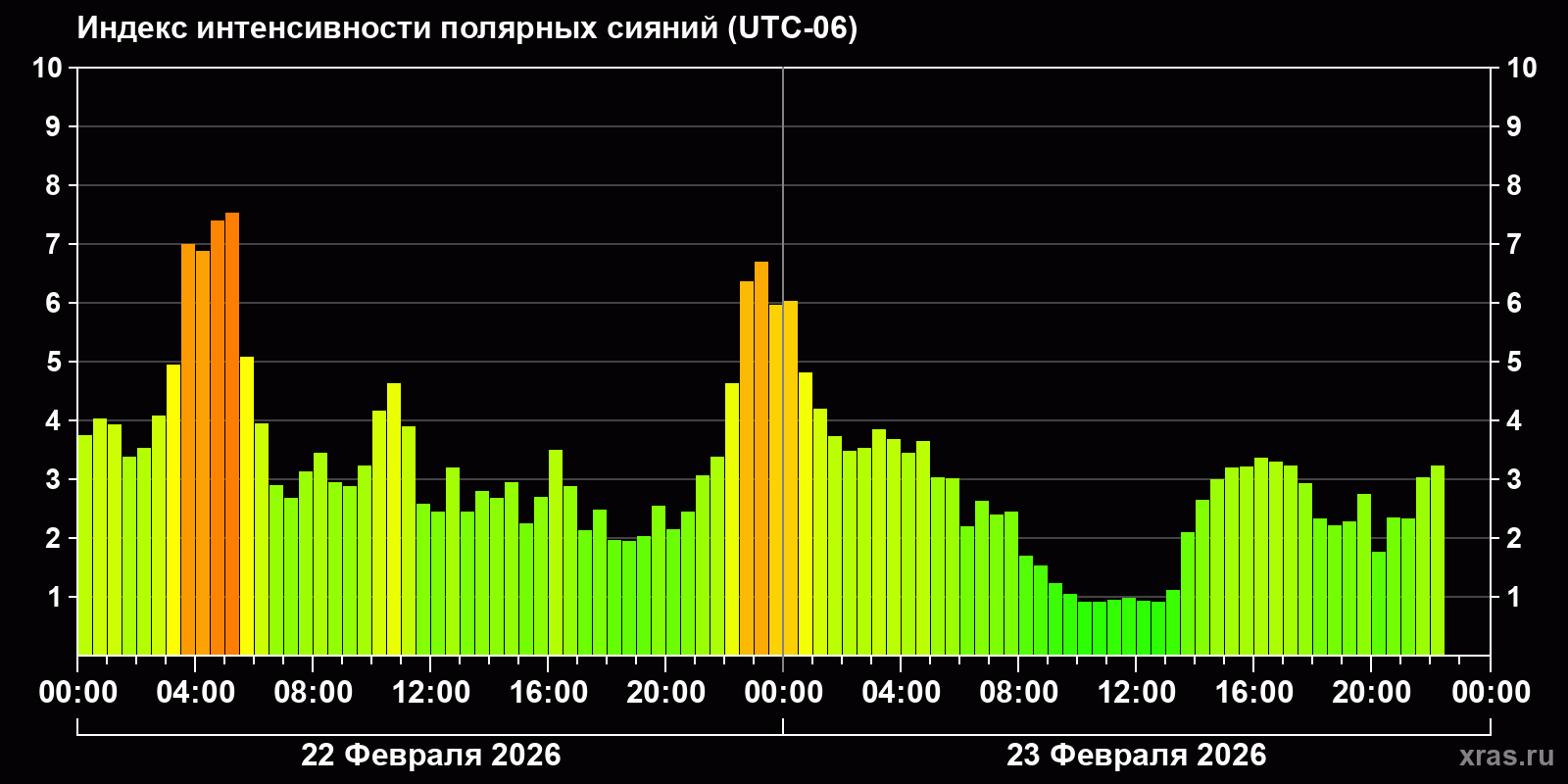 Изменения индекса интенсивности полярных сияний с 2026-02-22 по 2026-02-23 по местному времени