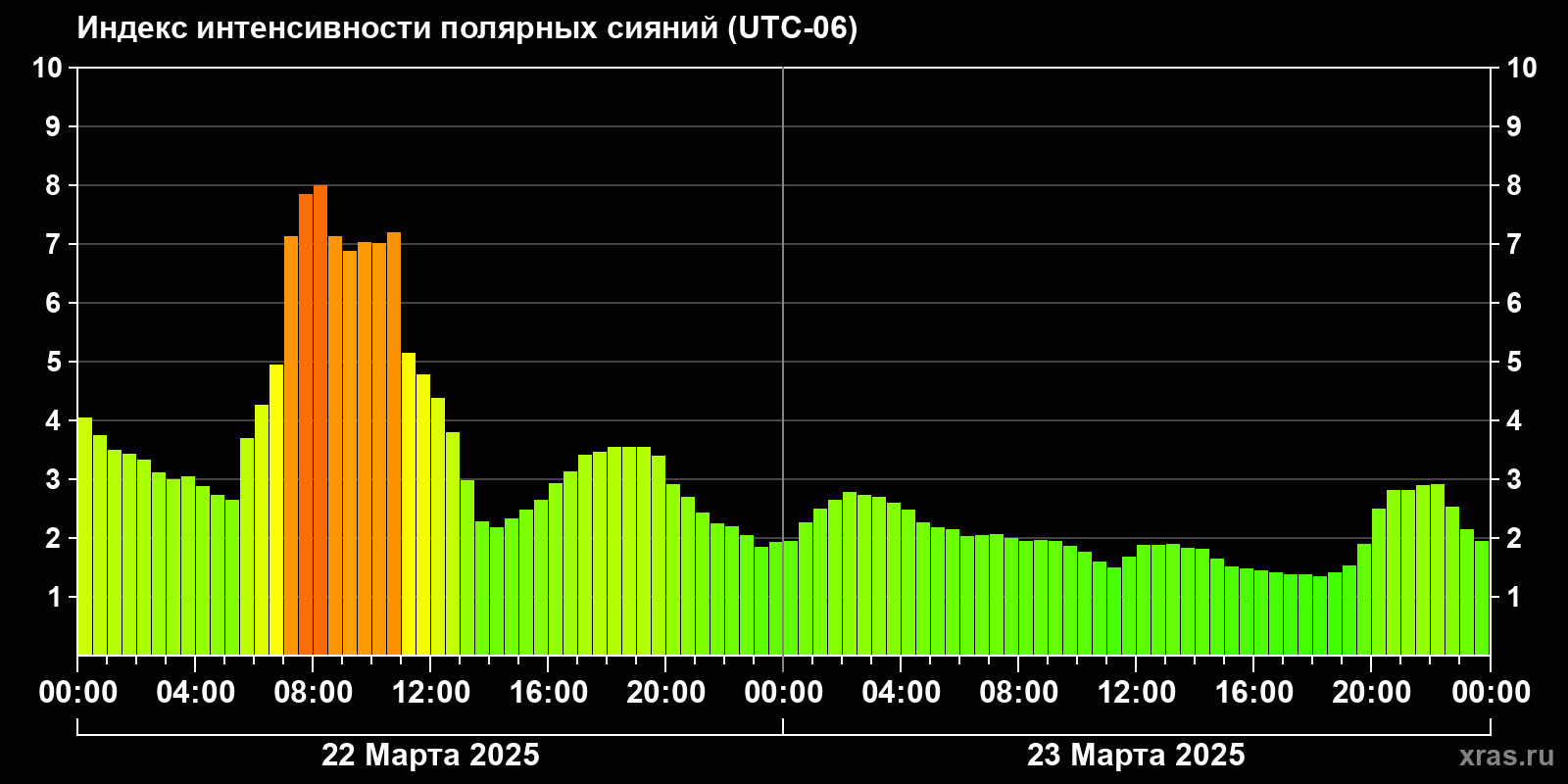Изменения индекса интенсивности полярных сияний с 2025-03-22 по 2025-03-23 по местному времени