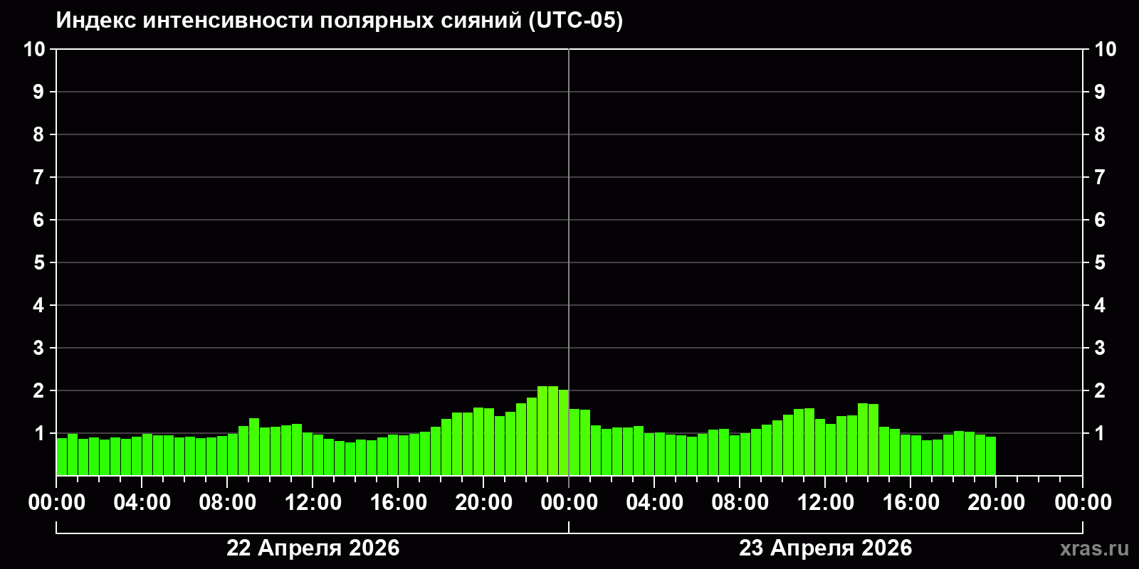 Изменения индекса интенсивности полярных сияний с 2026-04-22 по 2026-04-23 по местному времени