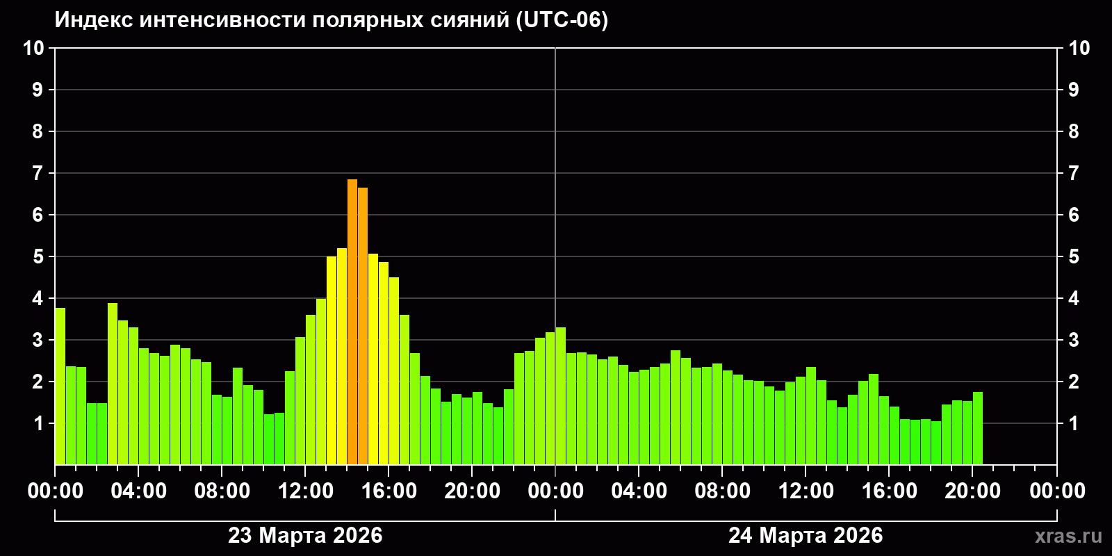 Изменения индекса интенсивности полярных сияний с 2026-03-23 по 2026-03-24 по местному времени