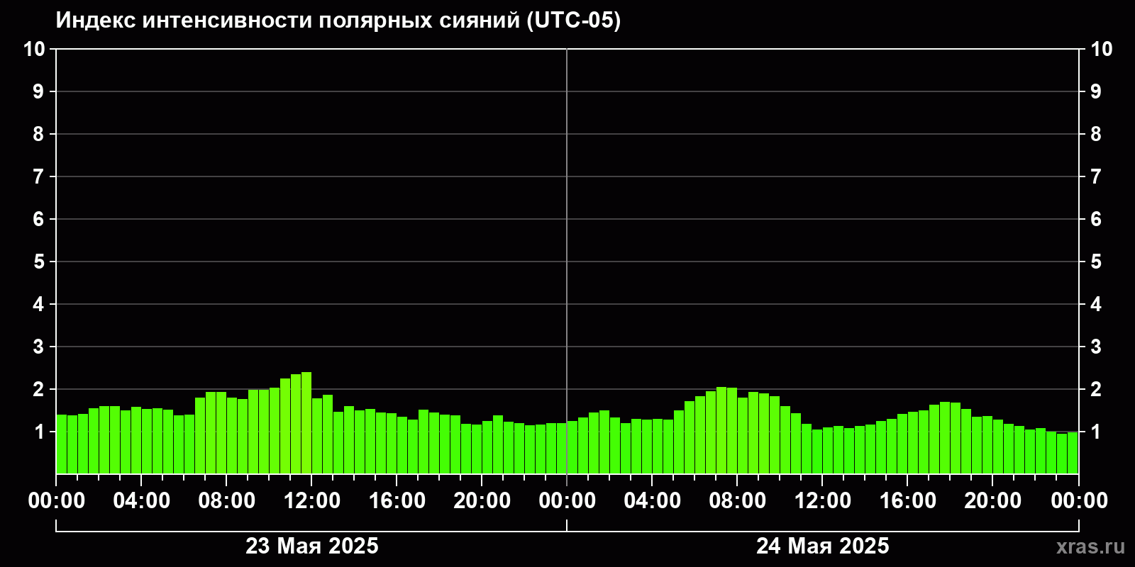 Изменения индекса интенсивности полярных сияний с 2025-05-23 по 2025-05-24 по местному времени