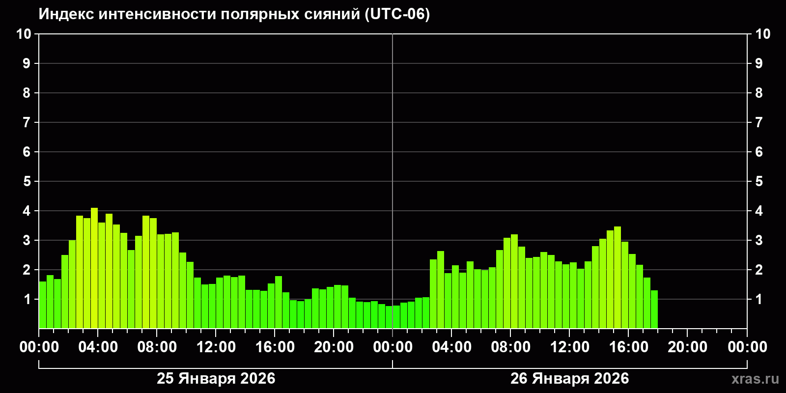 Изменения индекса интенсивности полярных сияний с 2026-01-25 по 2026-01-26 по местному времени