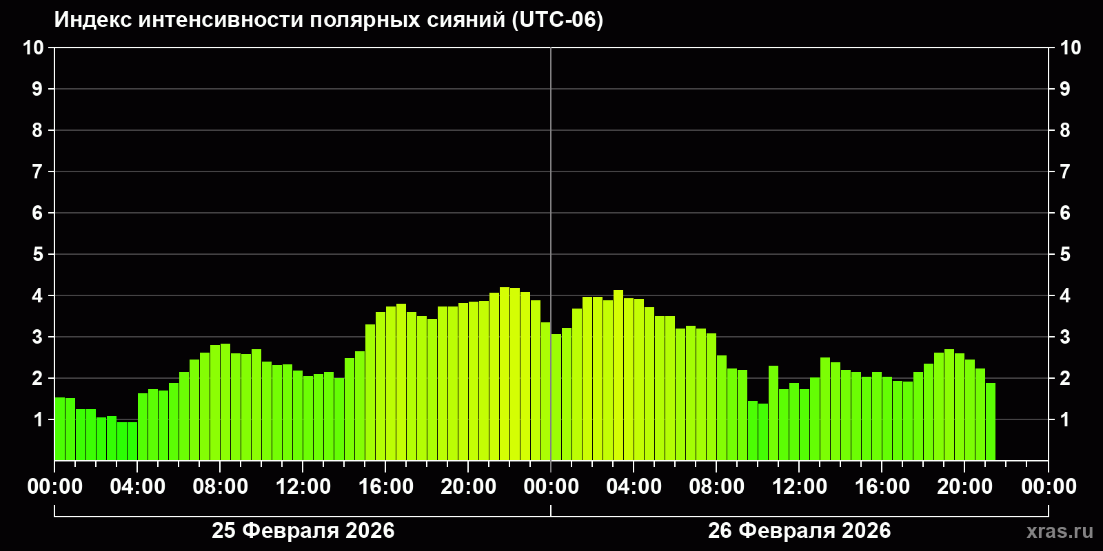 Изменения индекса интенсивности полярных сияний с 2026-02-25 по 2026-02-26 по местному времени