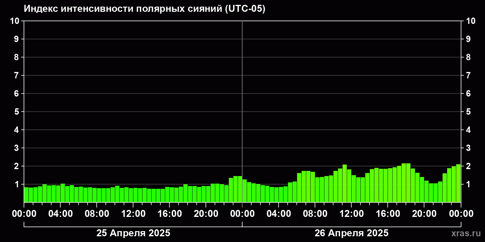 Изменения индекса интенсивности полярных сияний с 2025-04-25 по 2025-04-26 по местному времени