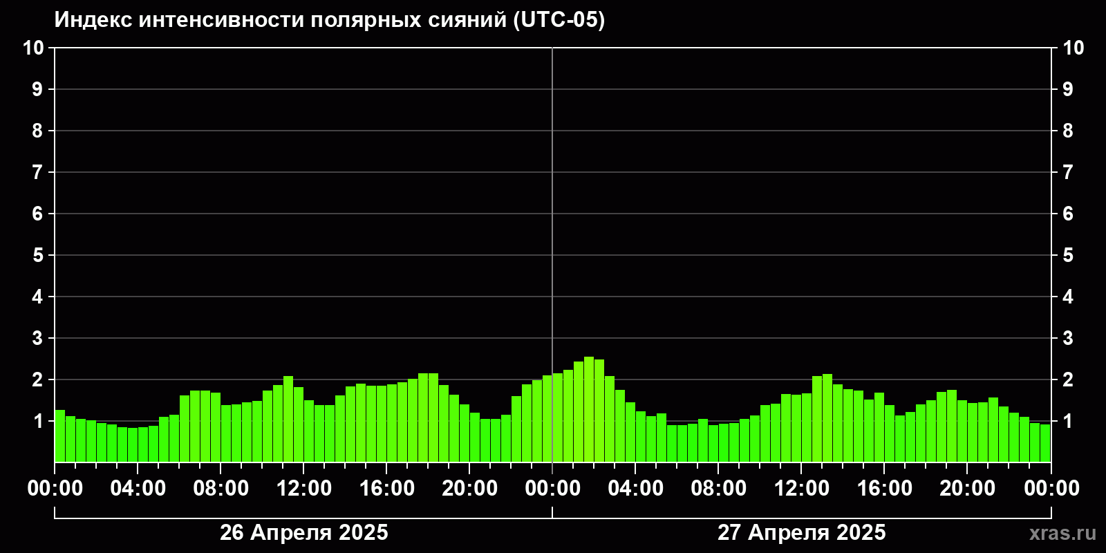 Изменения индекса интенсивности полярных сияний с 2025-04-26 по 2025-04-27 по местному времени