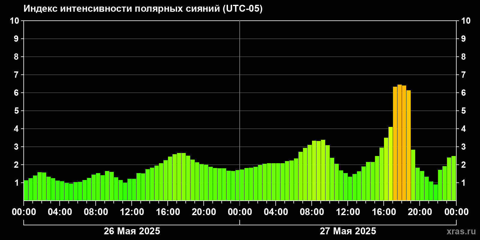Изменения индекса интенсивности полярных сияний с 2025-05-26 по 2025-05-27 по местному времени