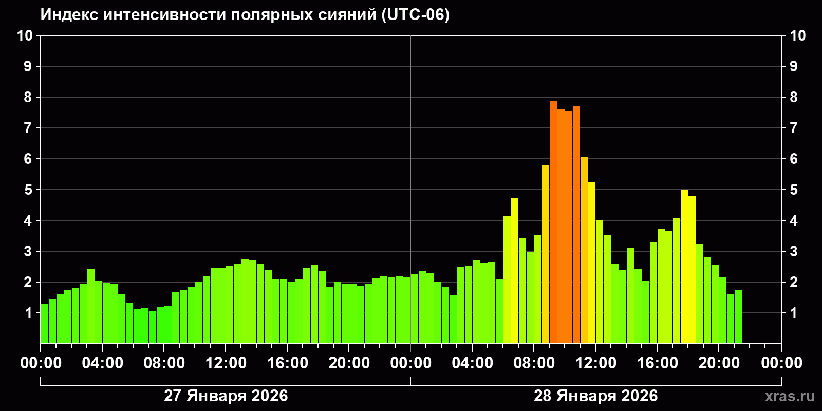 Изменения индекса интенсивности полярных сияний с 2026-01-27 по 2026-01-28 по местному времени