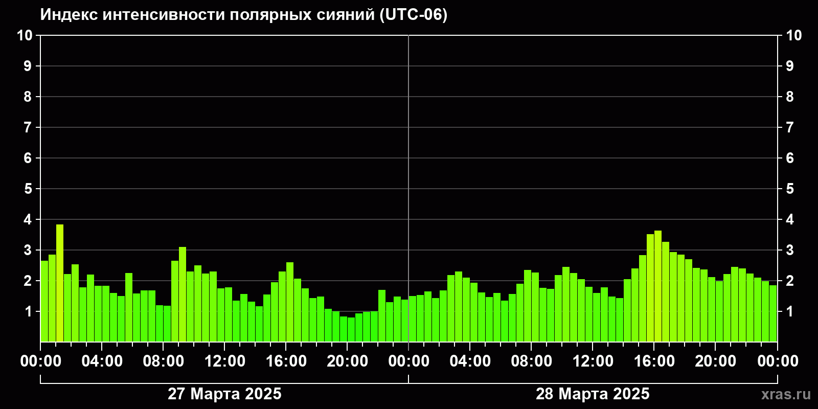 Изменения индекса интенсивности полярных сияний с 2025-03-27 по 2025-03-28 по местному времени