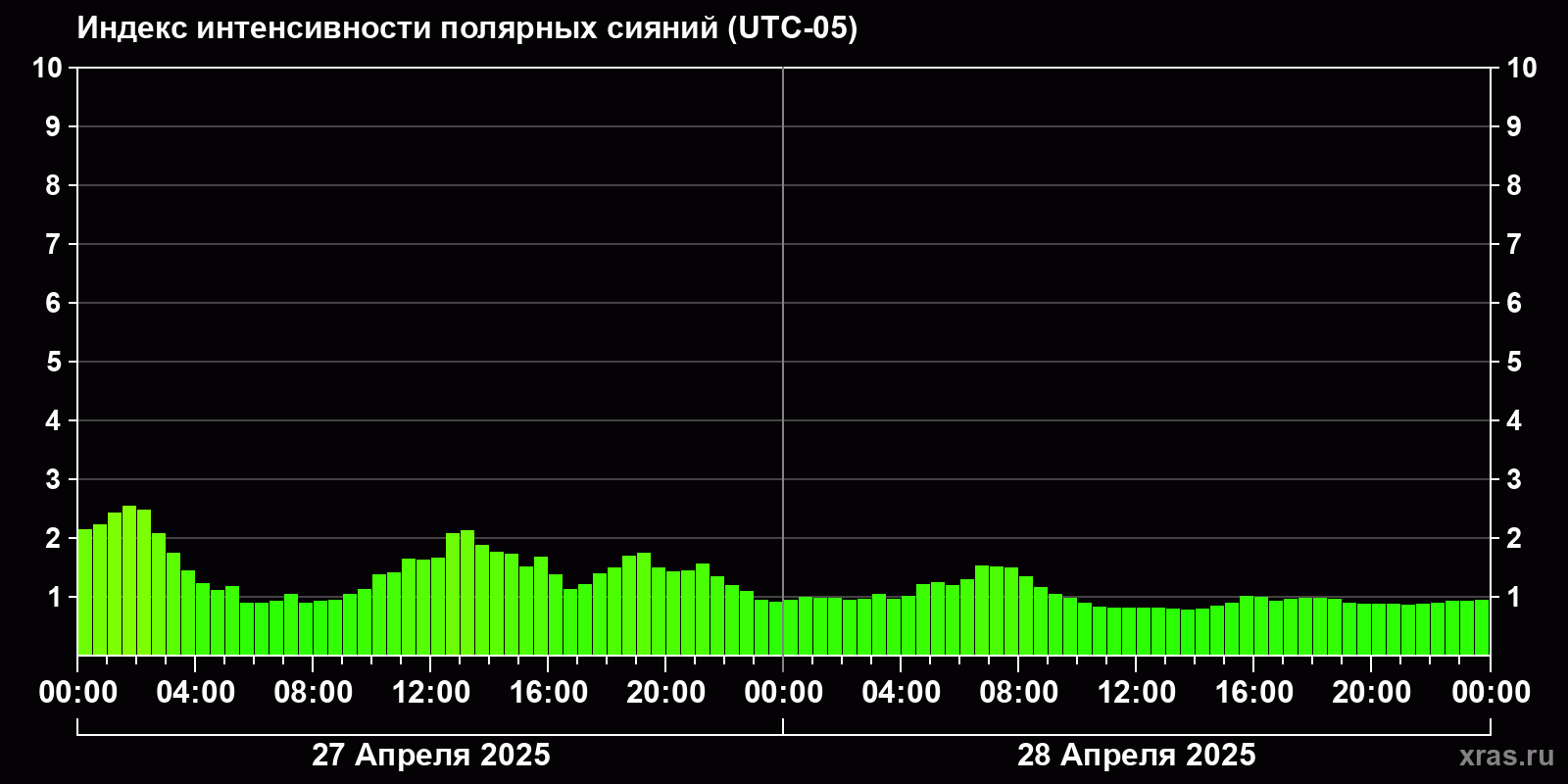 Изменения индекса интенсивности полярных сияний с 2025-04-27 по 2025-04-28 по местному времени