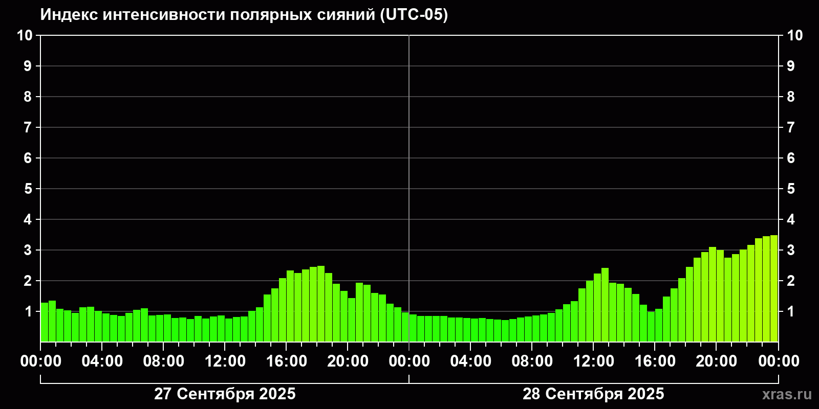Изменения индекса интенсивности полярных сияний с 2025-09-27 по 2025-09-28 по местному времени