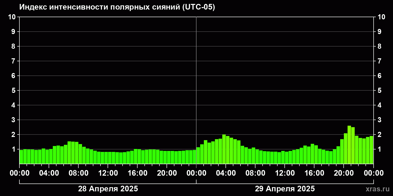 Изменения индекса интенсивности полярных сияний с 2025-04-28 по 2025-04-29 по местному времени