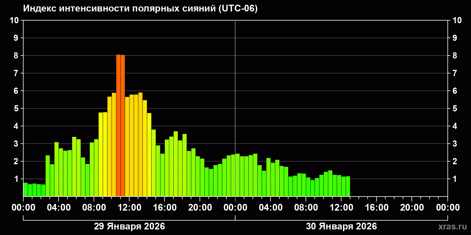 Изменения индекса интенсивности полярных сияний с 2026-01-29 по 2026-01-30 по местному времени