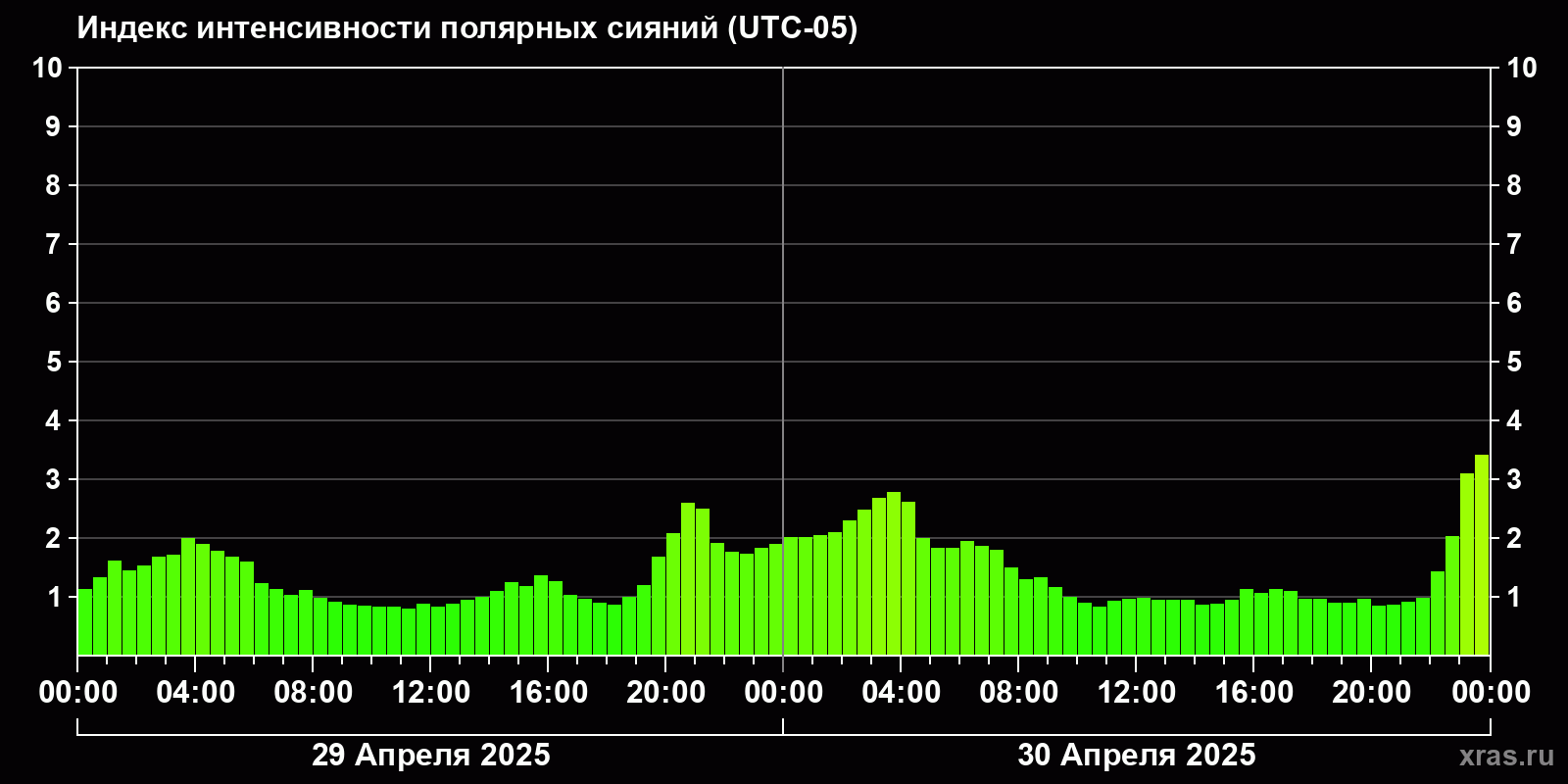 Изменения индекса интенсивности полярных сияний с 2025-04-29 по 2025-04-30 по местному времени