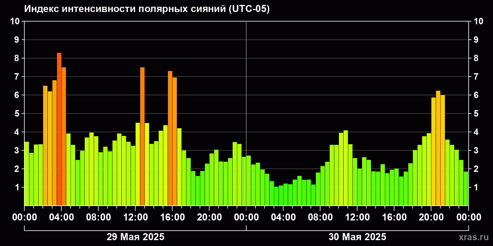 Изменения индекса интенсивности полярных сияний с 2025-05-29 по 2025-05-30 по местному времени