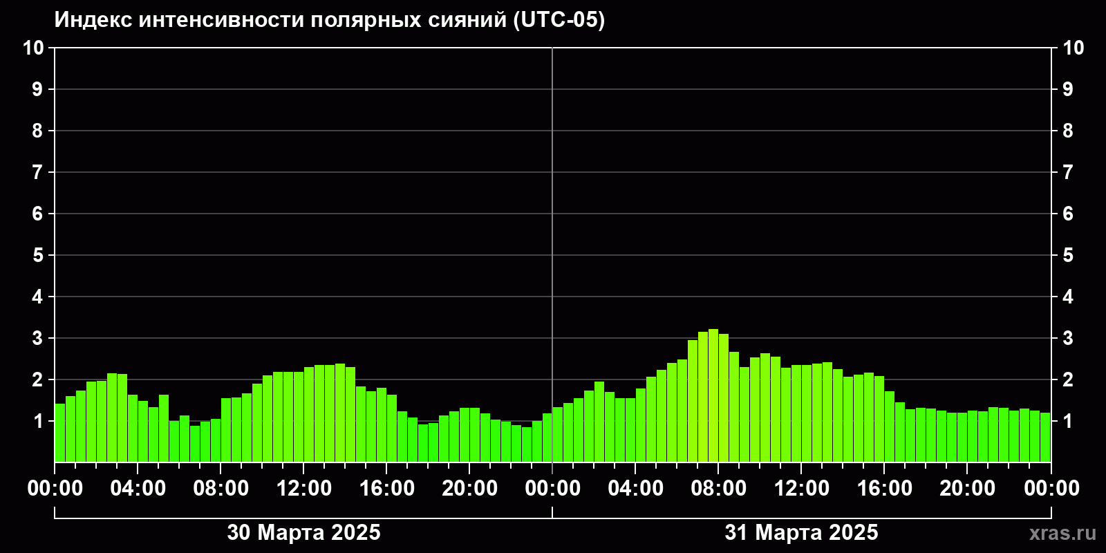 Изменения индекса интенсивности полярных сияний с 2025-03-30 по 2025-03-31 по местному времени