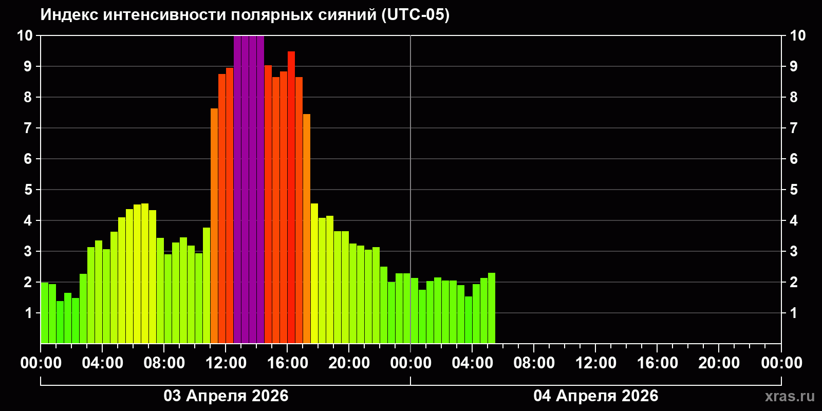 Изменения индекса интенсивности полярных сияний с 2026-04-03 по 2026-04-04 по местному времени