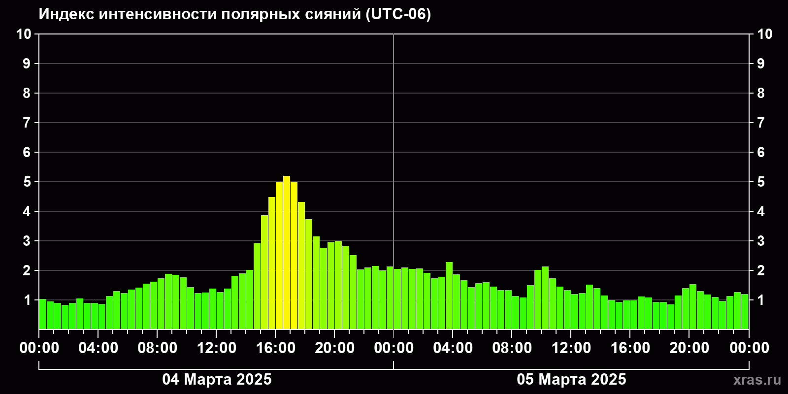 Изменения индекса интенсивности полярных сияний с 2025-03-04 по 2025-03-05 по местному времени