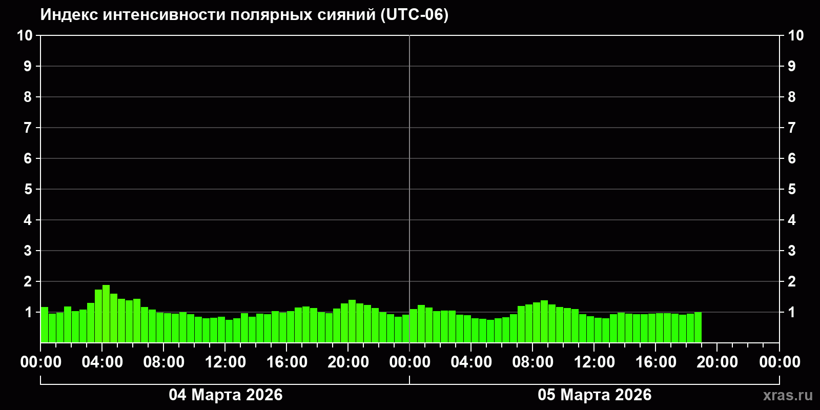 Изменения индекса интенсивности полярных сияний с 2026-03-04 по 2026-03-05 по местному времени