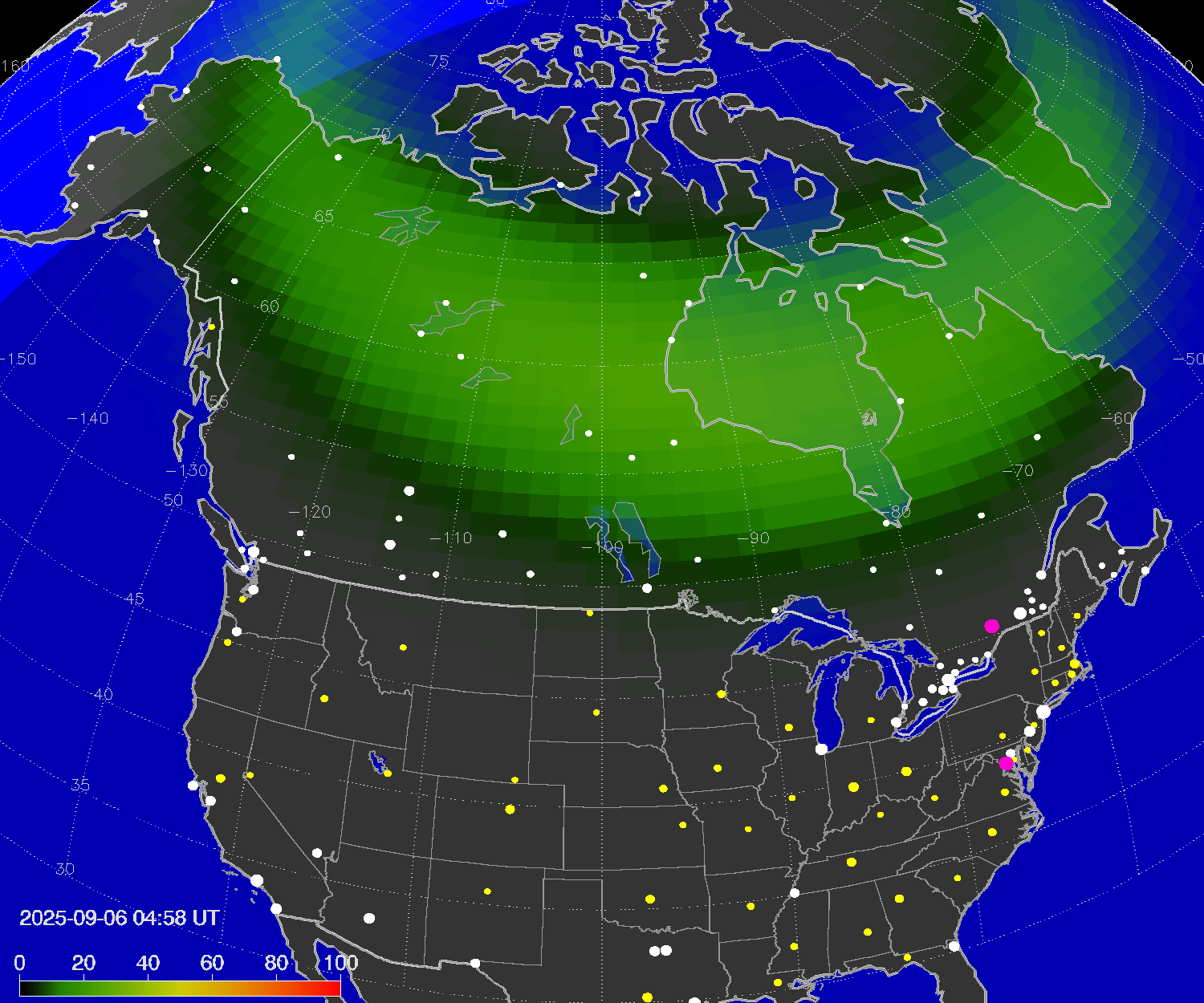 Вероятность полярных сияний в городах Канады