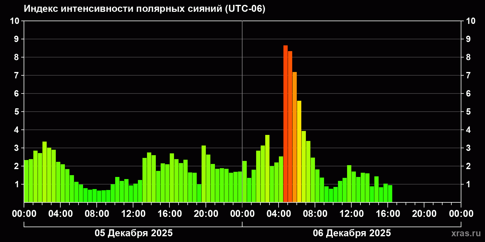 Изменения индекса интенсивности полярных сияний с 2025-12-05 по 2025-12-06 по местному времени