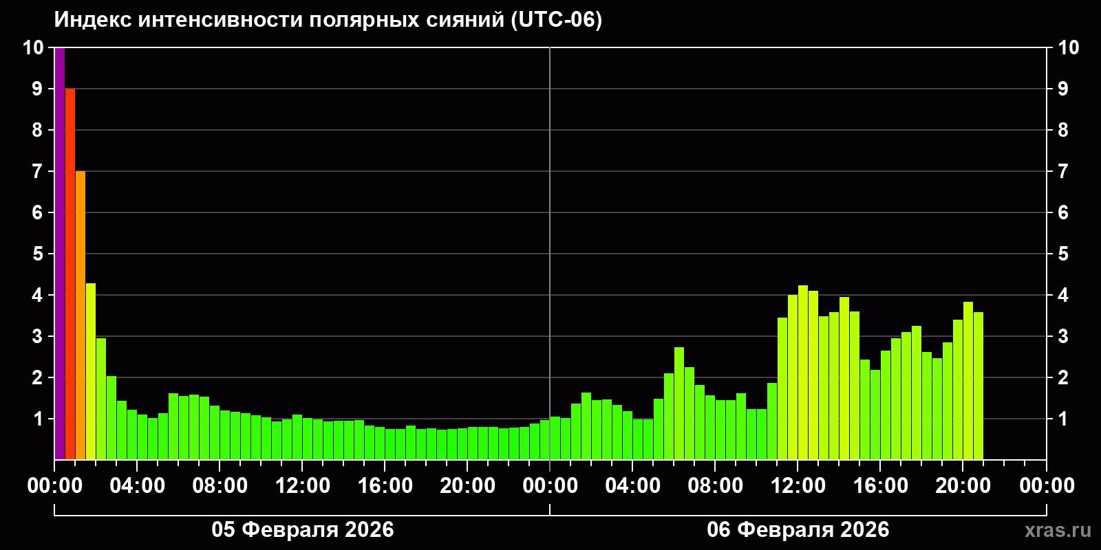 Изменения индекса интенсивности полярных сияний с 2026-02-05 по 2026-02-06 по местному времени